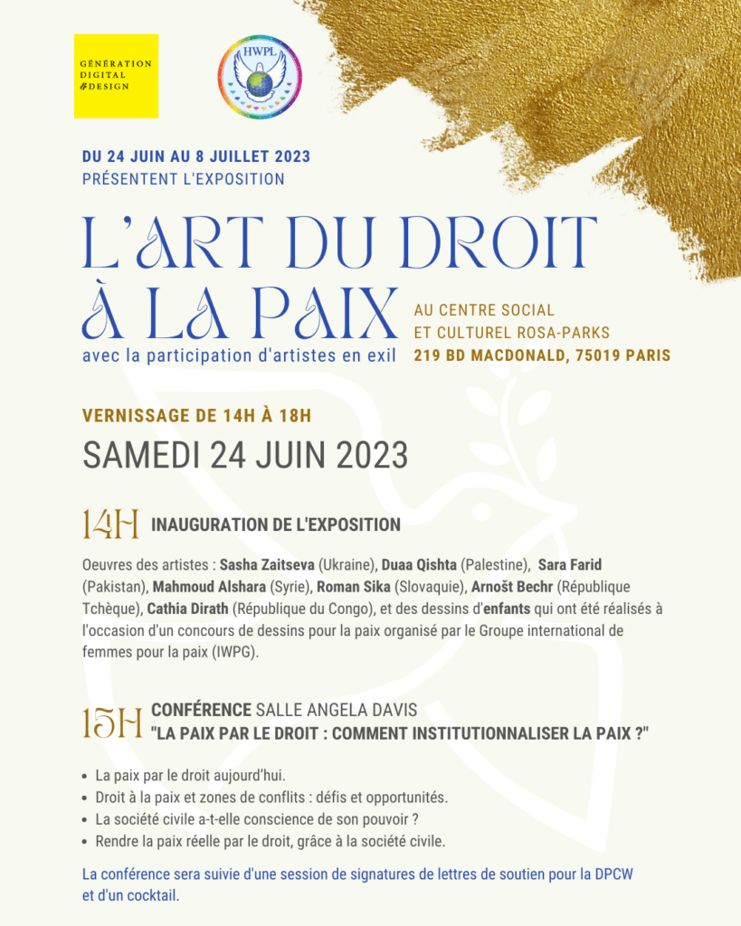 Dans cette même dynamique européenne, HWPL France s’associe au Groupe international des jeunes pour la paix (IPYG) et l’association solidaire et humaniste Génération Digital et Design pour proposer une exposition accompagnée d’une conférence, appelant à l’arrêt des guerres et à la construction commune d’un monde pacifique et respectueux des droits de l’Homme.